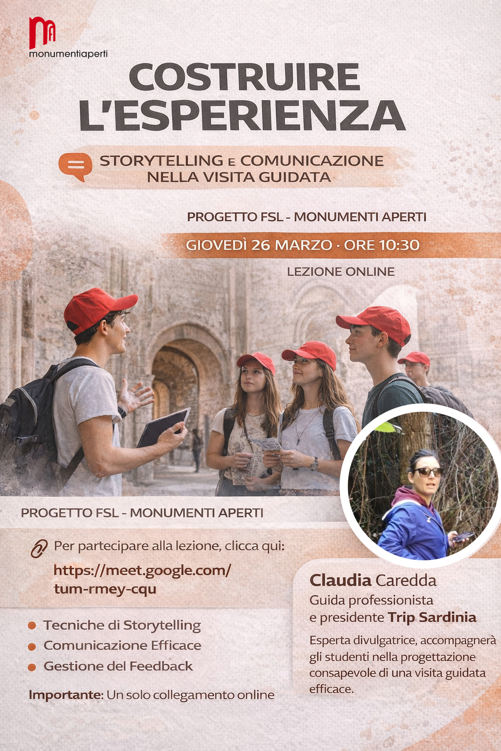 locandina “Costruire l’Esperienza: storytelling e comunicazione nella visita guidata”.
